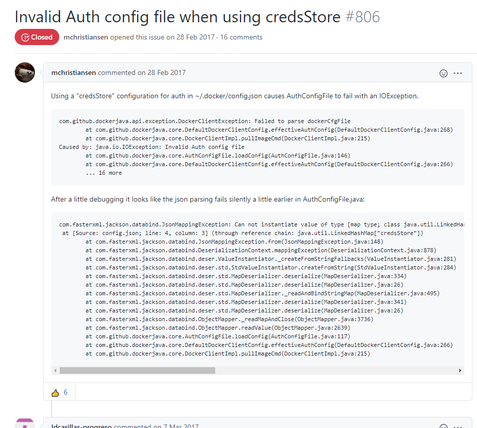com.fasterxml.jackson.databind.JsonMappingException: Can not instantiate value of type [map type; class java.util.LinkedHashMap, [simple type, class java.lang.String] -> [simple type, class com.github.dockerjava.api.model.AuthConfig]] from String value ('osxkeychain'); no single-String constructor/factory method